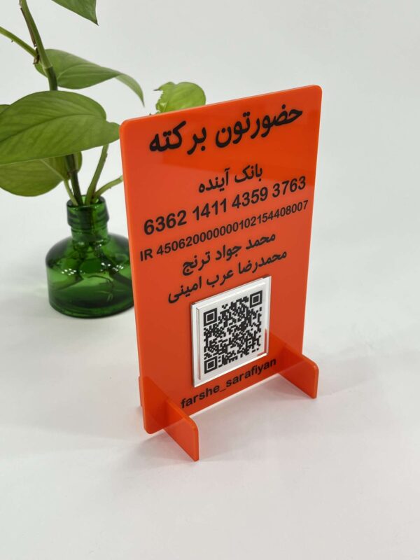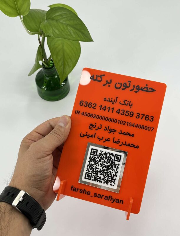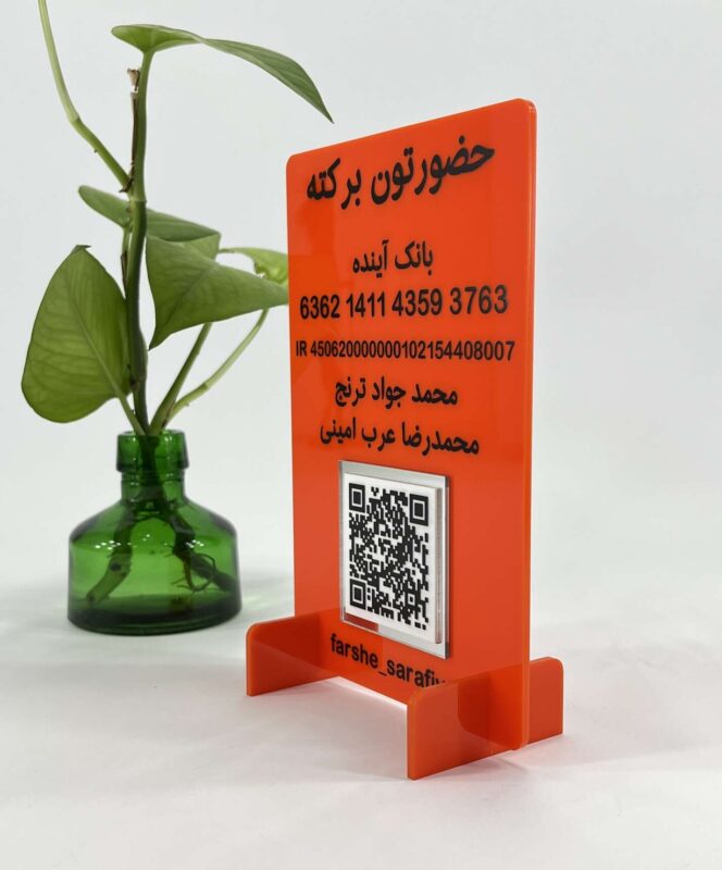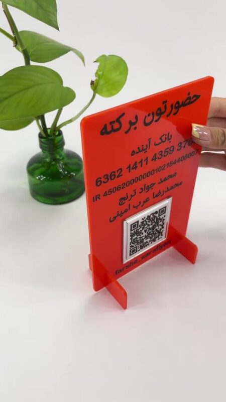 این محصول از پلکسی ضخیم و باکیفیت ساخته شده که هم دوام بالایی دارد و هم در برابر خط و خش مقاوم است. نوشتهها و اطلاعات از طریق چاپ فلتبد با وضوح بالا اجرا شدهاند که ماندگاری طولانی و خوانایی بالا را تضمین میکند. وجود QR کد باعث میشود مشتریان فقط با یک اسکن ساده، به راحتی پرداخت را انجام دهند — راحت، سریع و بدون خطا 🧾📲