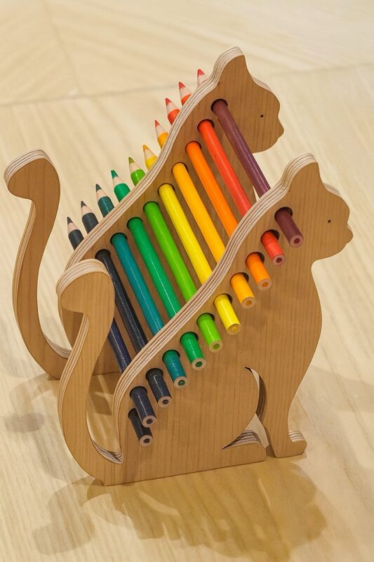 استند مداد رنگی دارای بدنهای از چوب سهلایه مرغوب با طرح گربهای است. دو طرف آن به شکل گربه با دم منحنی طراحی شده که سوراخهای استوانهای برای قرار گرفتن مدادها تعبیه شدهاند. ابعاد آن مناسب برای قرار گرفتن روی هر میز تحریر یا میز کار است و سبک طراحی باعث میشود مدادها به طور مرتب، منظم و زیبا نمایش داده شوند.