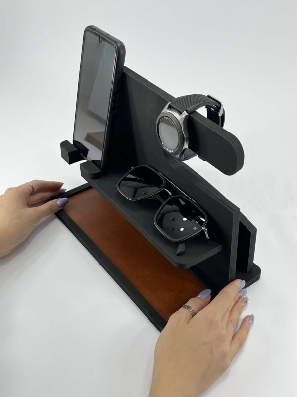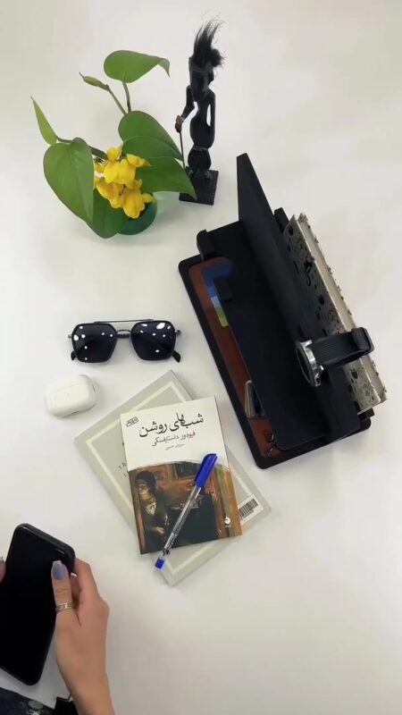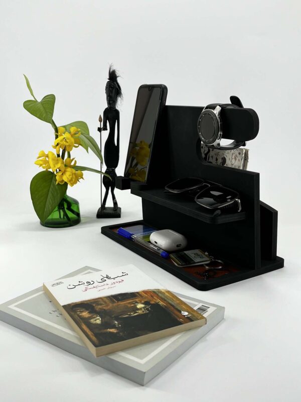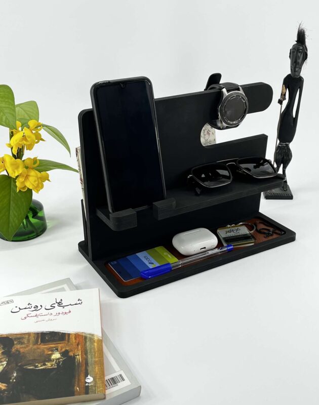 برای ساعت و عینک هم جای اختصاصی در نظر گرفته شده تا هم محافظت بشن و هم همیشه دم دست باشن. بخش پایین استند، یه فضای مخفی برای کارتها، ایرپاد، خودکار، فلش یا کلید داره که بهت کمک میکنه همه چی منظم و سر جای خودش باشه. چه روی میز کار اداری باشه، چه روی میز تحریر خونه یا حتی کنار تخت، این استند یه همراه کاربردی و شیکه.