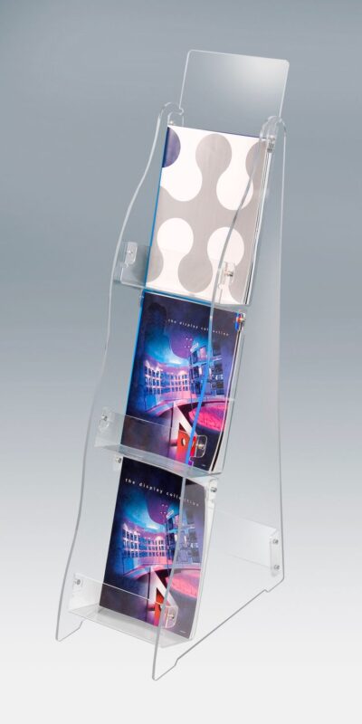این استند از پلکسی شفاف ۳ میلیمتری ساخته شده و دارای طراحی خمیده و مدرن با چند طبقه برای قرارگیری انواع بروشور و کاتالوگ میباشد. اتصالات آن با پیچهای شفاف مستحکم شده است.