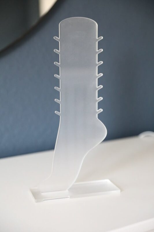 این محصول از پلکسی ۳ میلیمتری نیمهشفاف ساخته شده و به شکل پای انسان طراحی شده. دارای برشهای جانبی برای نگهداری چند پابند است و روی یک پایهی صاف و محکم نصب شده که ایستایی مناسبی روی سطح میز ایجاد میکند.