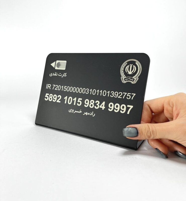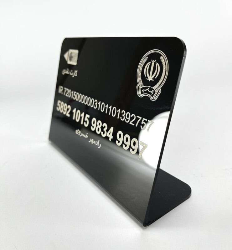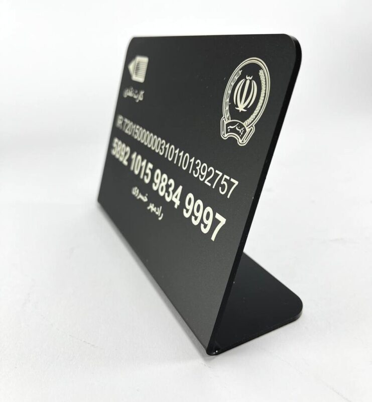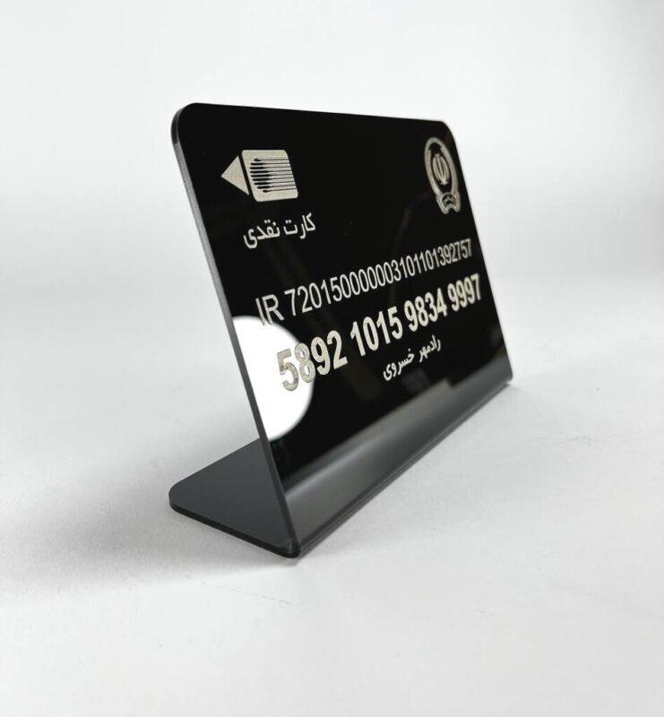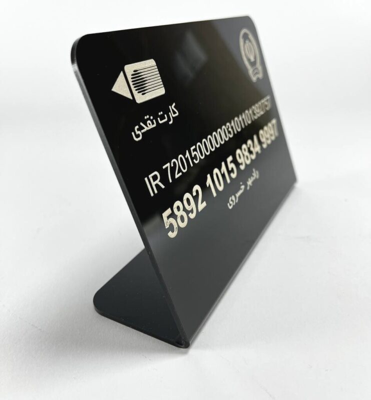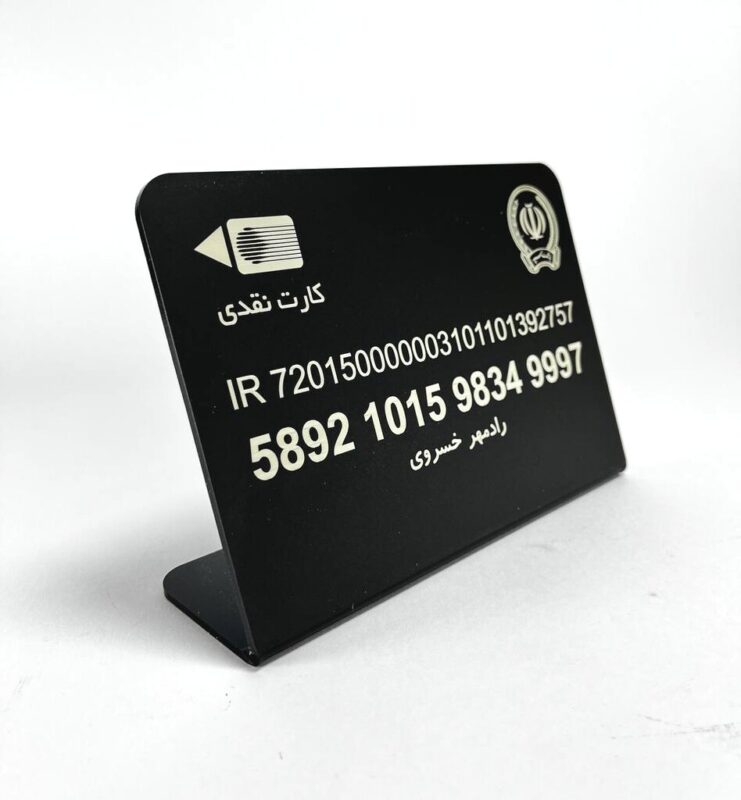 استند پلکسی شماره کارت بانکی از پلکسی با ضخامت ۳ میلیمتر ساخته شده است. طراحی دقیق و زیبا، همراه با حکاکی نام بانک و اطلاعات کارت، ظاهری مدرن و تمیز به محصول داده است.