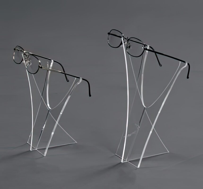 این استند از پلکسی گلاس شفاف با ضخامت ۳ میلیمتر ساخته شده و دارای طراحی V شکل با زوایای دقیق و متعادل است. پایه سهگوش آن باعث ایستایی بالا میشود و بازوهای منحنیشکل عینک را در ارتفاع مناسب نگه میدارند.