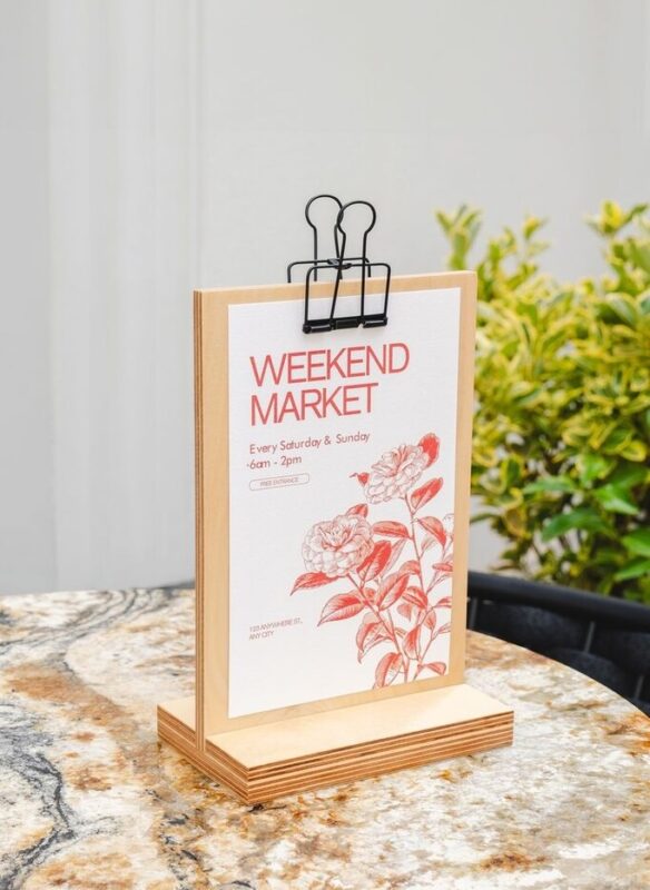 این استند از چوب سهلایه ساخته شده و شامل یک صفحه نگهدارنده و یک پایه محکم است. روی بخش بالایی با استفاده از یک گیره فلزی مشکی، کاغذ یا منو ثابت میشود و ظاهری ساده و شیک دارد.
