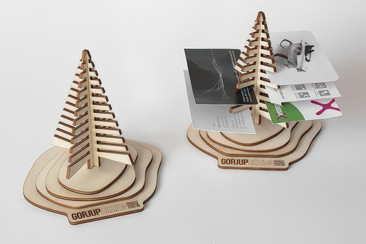 این استند به شکل یک درخت با لایههای پایهی زیبا طراحی شده است. رنگ طبیعی چوب سهلایه و لبههای برش لیزری، جلوهای مدرن و چشمنواز به آن بخشیده است.