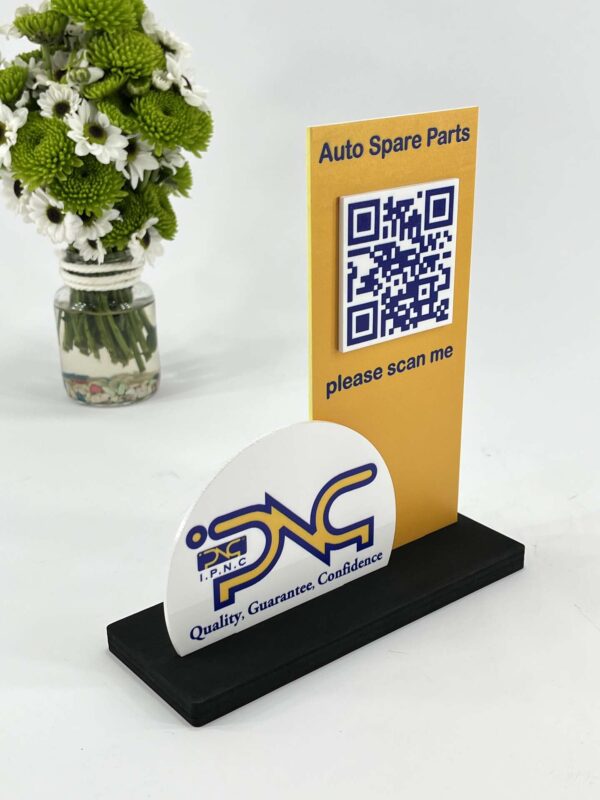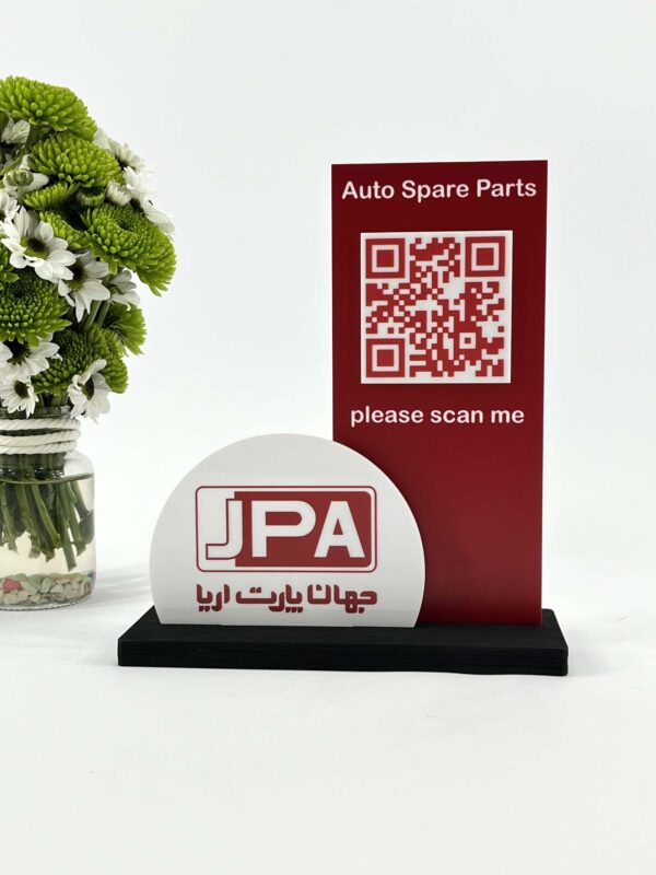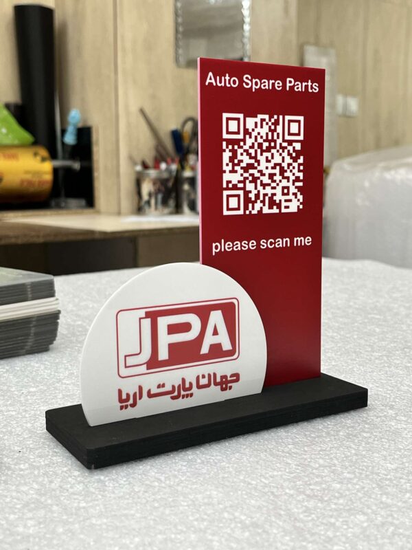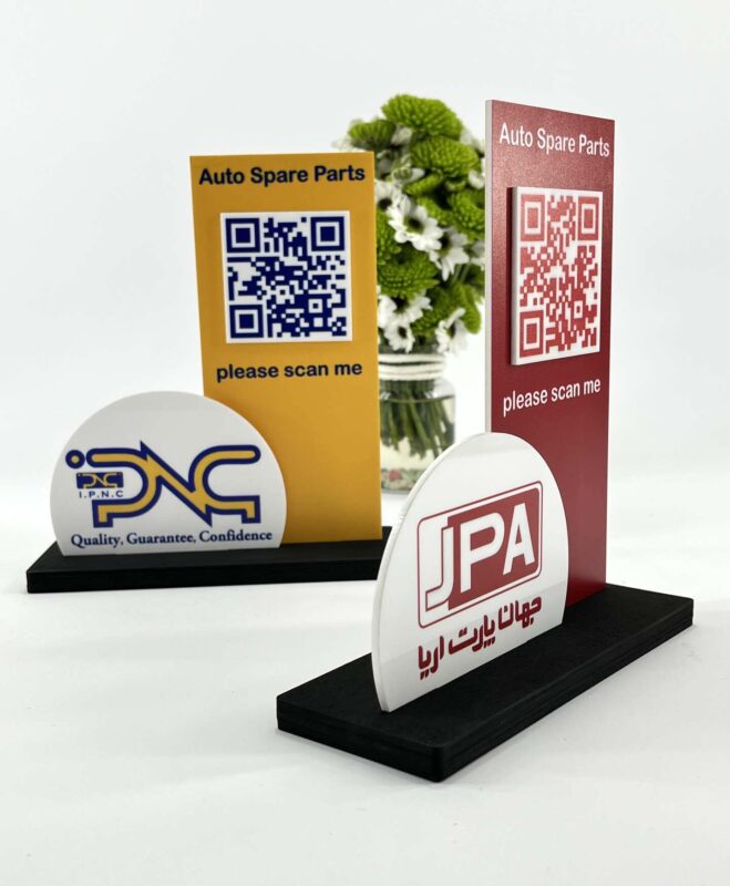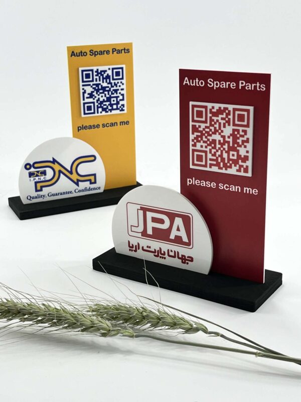 صفحه پلکسی رنگی با چاپ فلتبد، QR کد برجسته، لوگوی اختصاصی چاپشده، پایه چوبی مشکی و طراحی عمودی ایستاده با ابعاد جمعوجور و شیک.