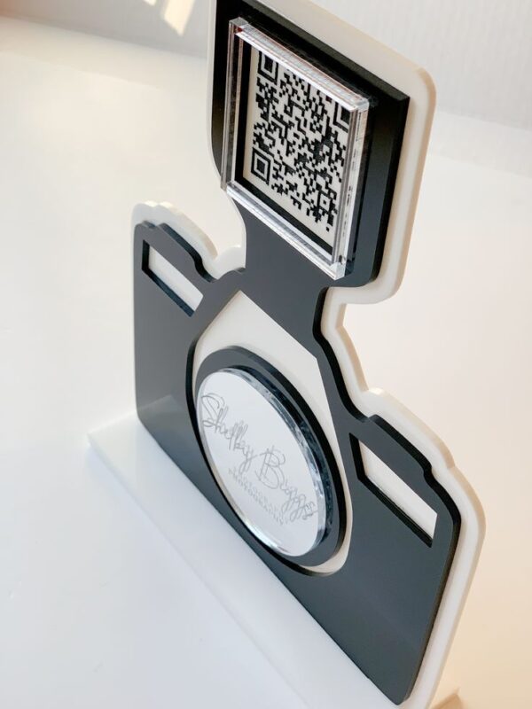 این استند از پلکسی گلاسه ۳ میلیمتری ساخته شده و به شکل دوربین عکاسی طراحی شده است. رنگبندی آن مشکی و سفید با لایهبندی دقیق است. QR Code روی بخش بالایی قرار دارد و قسمت لنز دوربین نیز با پلکسی شفاف طراحی شده است که جلوهای خاص به استند میدهد.