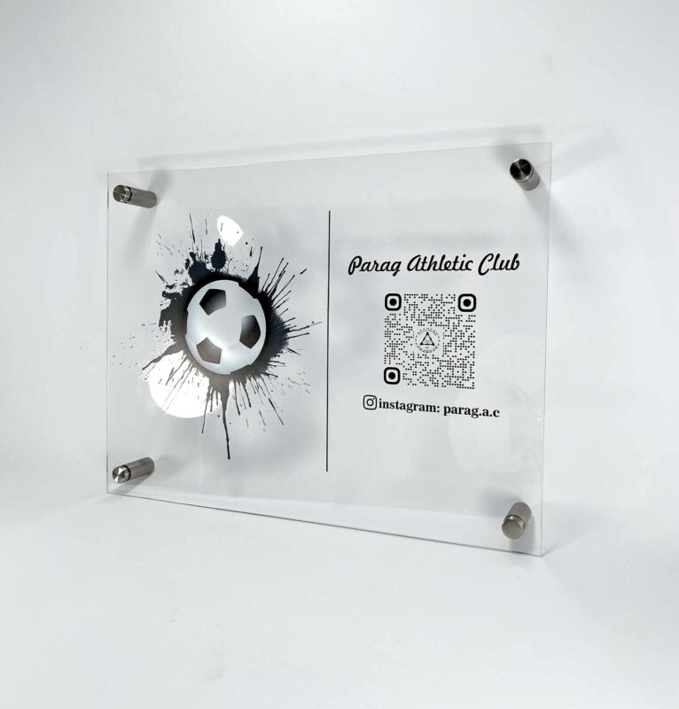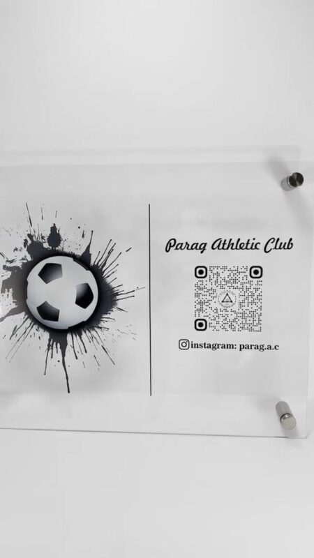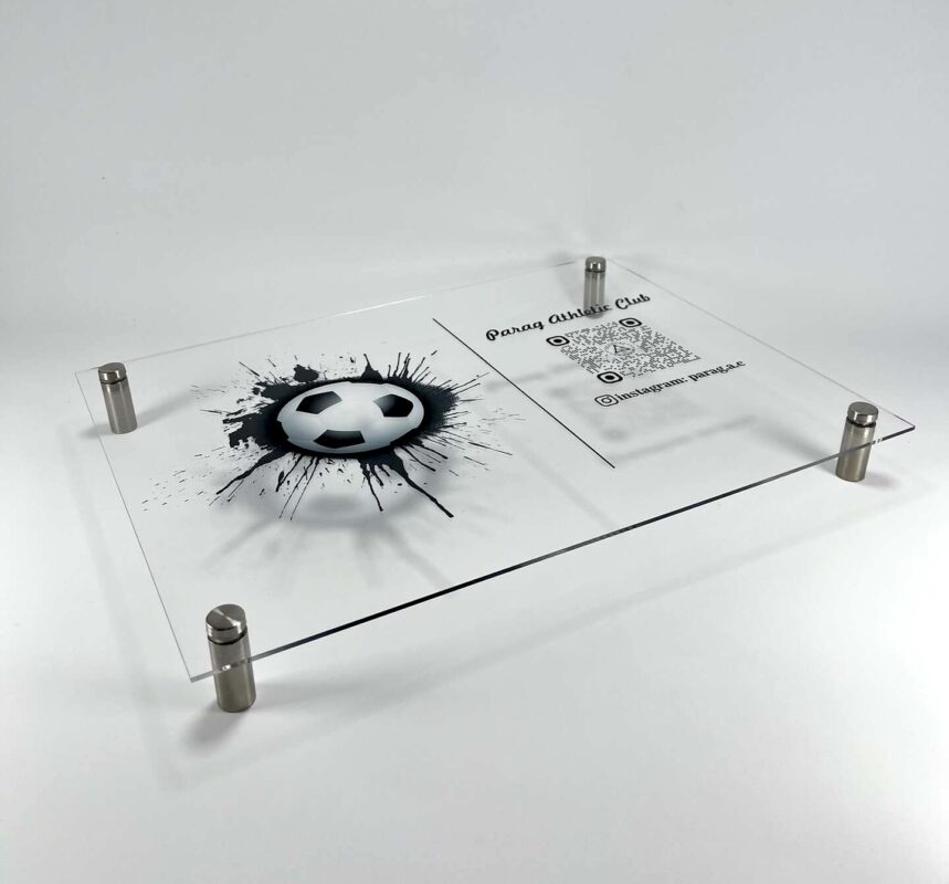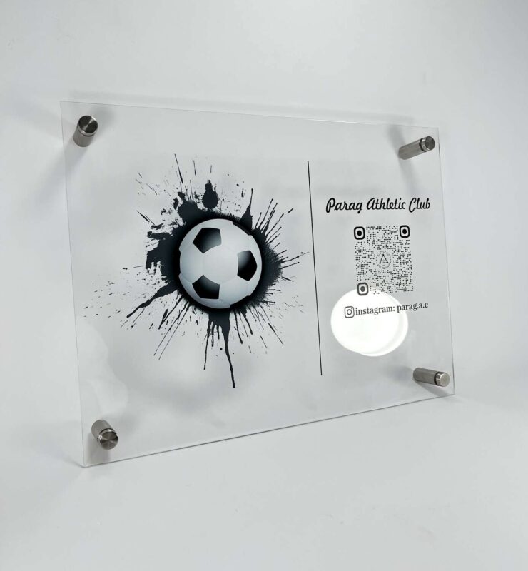این محصول با متریال پلکسی شفاف و مقاوم ساخته شده و با استفاده از تکنولوژی چاپ فلتبد، طرح لوگو و QR کد به شکلی دقیق و با کیفیت بالا روی آن چاپ شده است. در قسمت طراحی، تلفیق خلاقانهی تصویر توپ فوتبال با افکت پاشش رنگی، جلوهای خاص و مدرن به تابلو بخشیده و حس برندهای ورزشی را بهخوبی منتقل میکند.