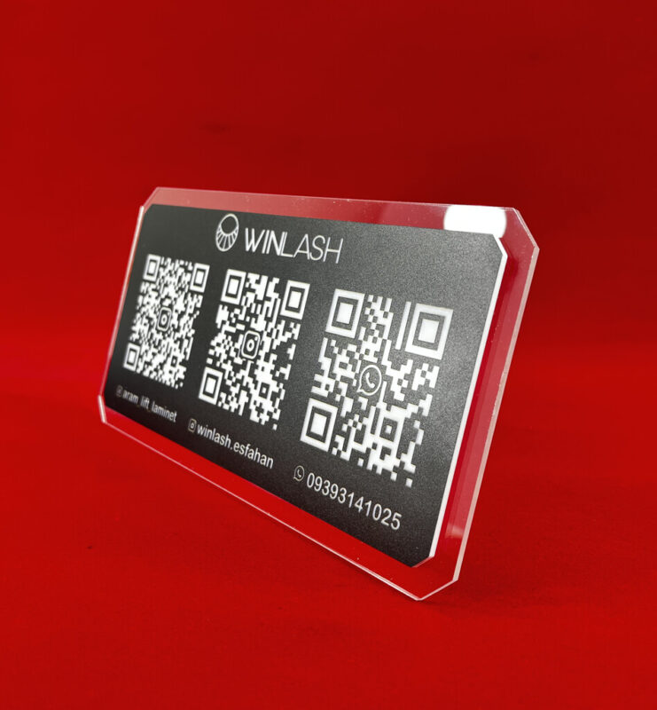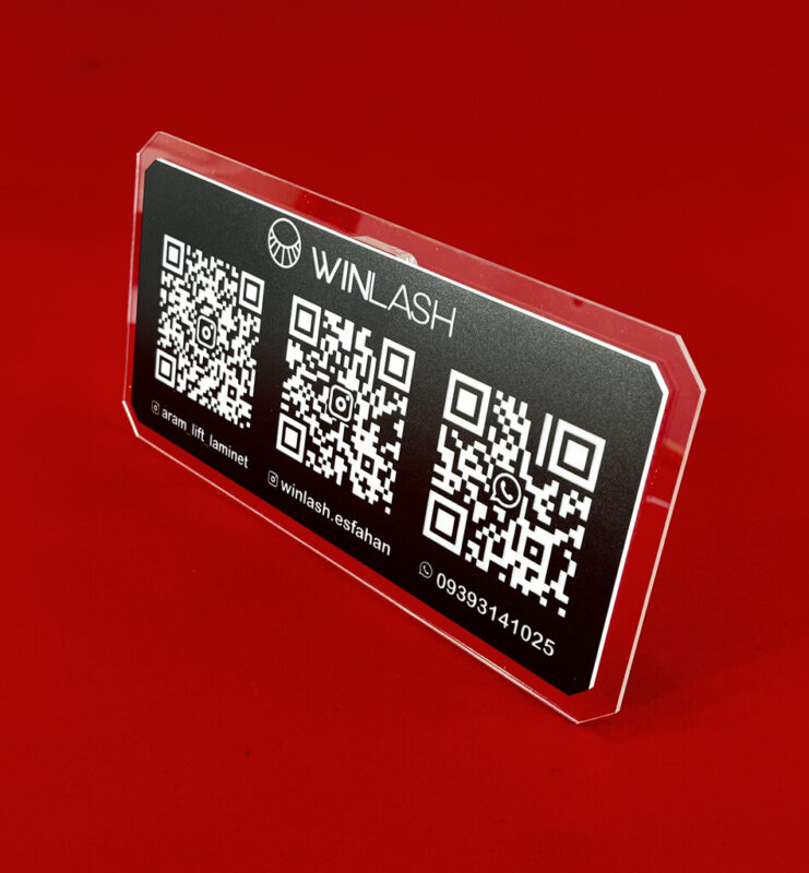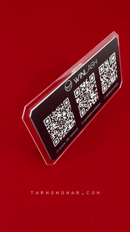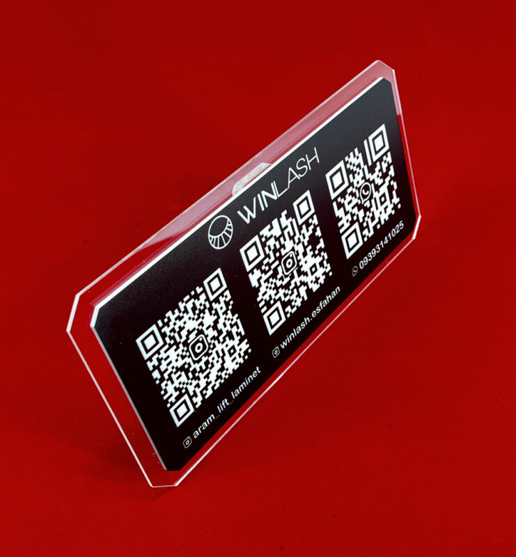 استند دارای صفحه مستطیلی با گوشههای زاویهدار است. پلکسی شفاف به عنوان پایه و زمینه مشکی به عنوان بستر QR کدها، تضاد بصری جذابی ایجاد کردهاند. چاپ سفید روی مشکی خوانایی بالایی دارد و طراحی کلی بسیار تمیز و دقیق انجام شده است.