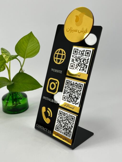 این استند از پلکسی دو لایه ساخته شده و دارای طراحی ایستاده رومیزی است. لوگو و آیکونها به صورت برجسته روی بدنه قرار دارند و QR کدها با وضوح بالا درج میشوند.
