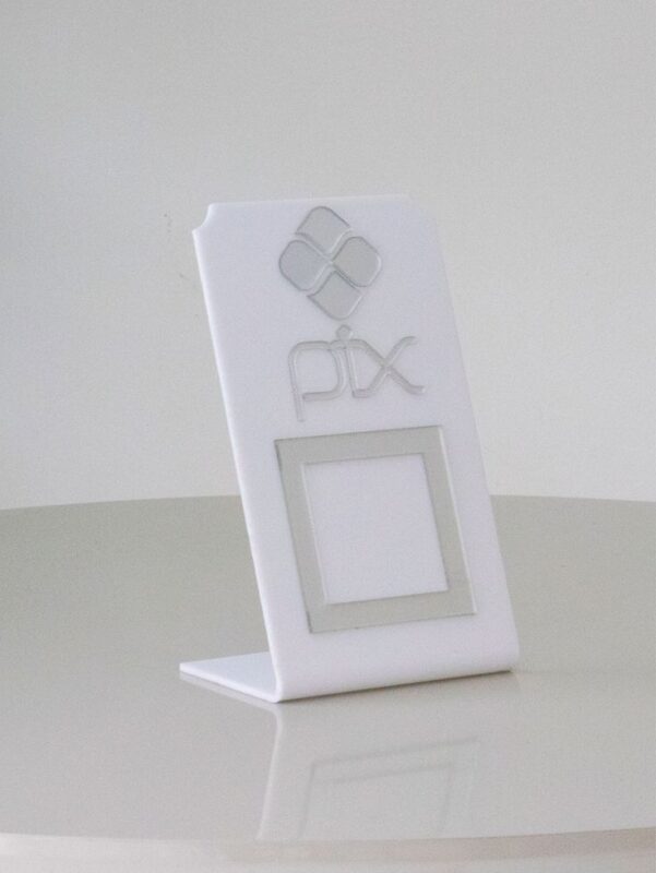 ساختهشده از پلکسی سفید با ضخامت ۳ میلیمتر، دارای پایه شیبدار برای قرارگیری روی میز، بخش تعویضپذیر QR کد با فریم برجسته، و لوگوی بالای استند به صورت برجسته طراحی شده است.