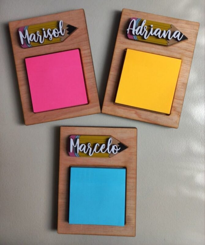 استند از چوب سه لایه با رنگ طبیعی ساخته شده و دارای یک محفظه برای یادداشت چسبدار (پست ایت) است. قسمت بالای استند با طرح مداد و نام یا متن اختصاصی تزئین شده و ظاهر کاملاً شخصیسازی شده به محصول میدهد.