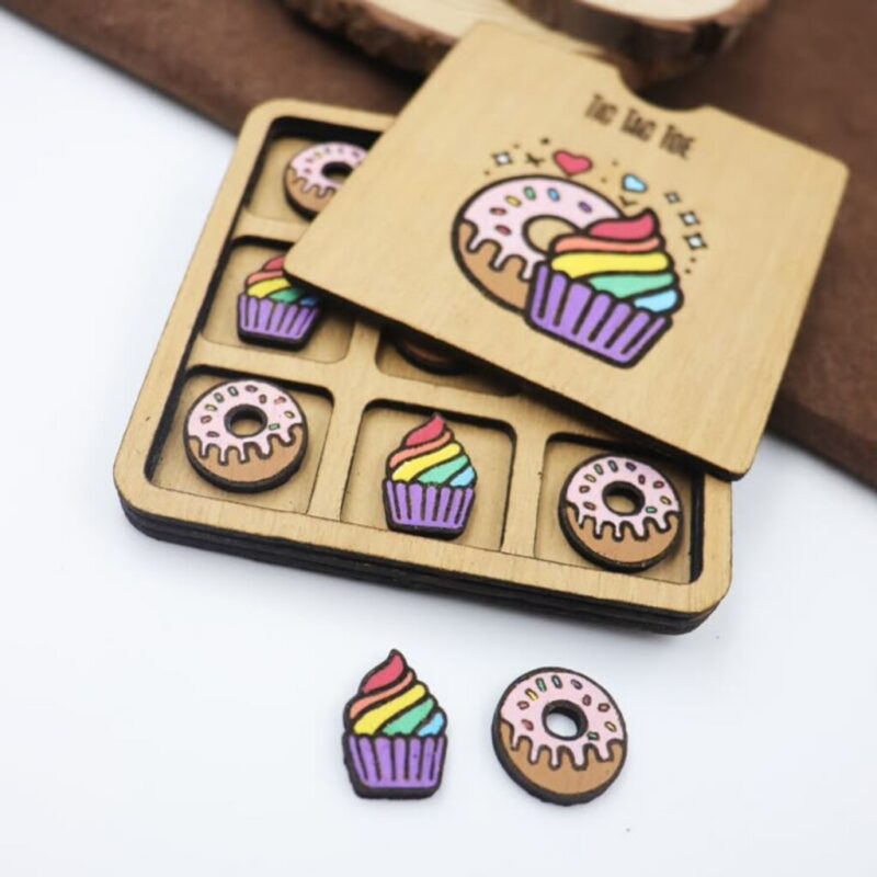 شامل یک صفحه چوبی با ابعاد مربع و درب کشویی، دارای ۹ جایگاه برای بازی و ۱۰ مهره رنگی (۵ دونات، ۵ کاپکیک). چاپ رنگی شاد روی چوب سهلایه ۳ میل، با طراحی تمیز و جذاب.