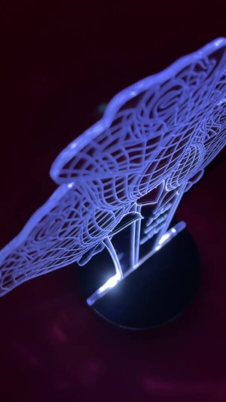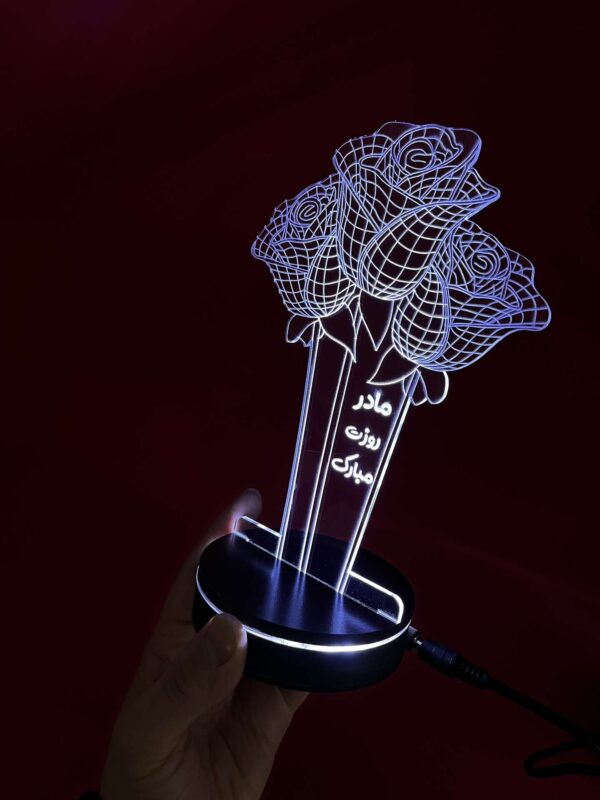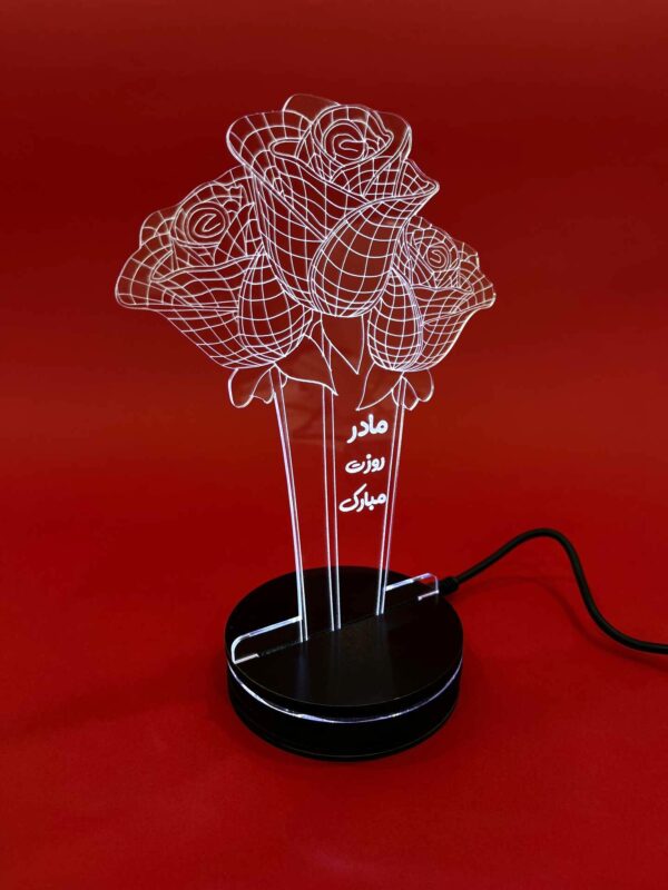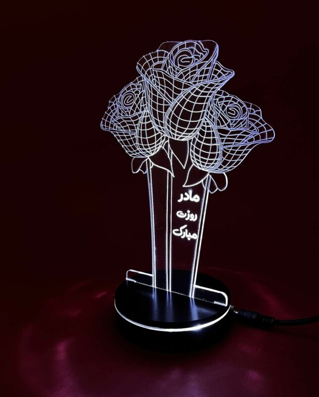 این محصول از ورق پلکسی شفاف با حکاکی لیزری ظریف ساخته شده که با روشن شدن نور LED، خطوط گلها بهصورت چشمنواز و درخشان جلوهگر میشن. متن “مادر، روزت مبارک” بهزیبایی در دل این اثر حک شده و حس عاطفی و عاشقانه اون رو چند برابر میکنه.