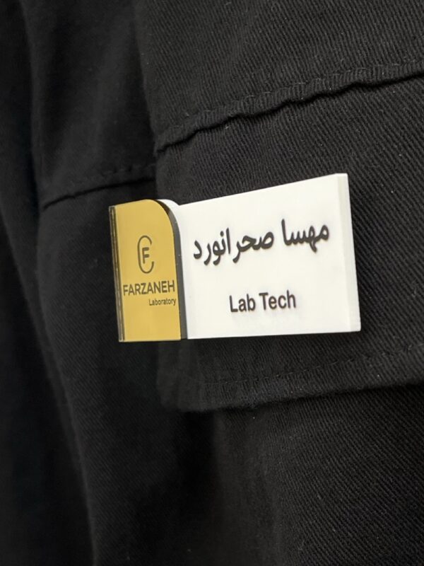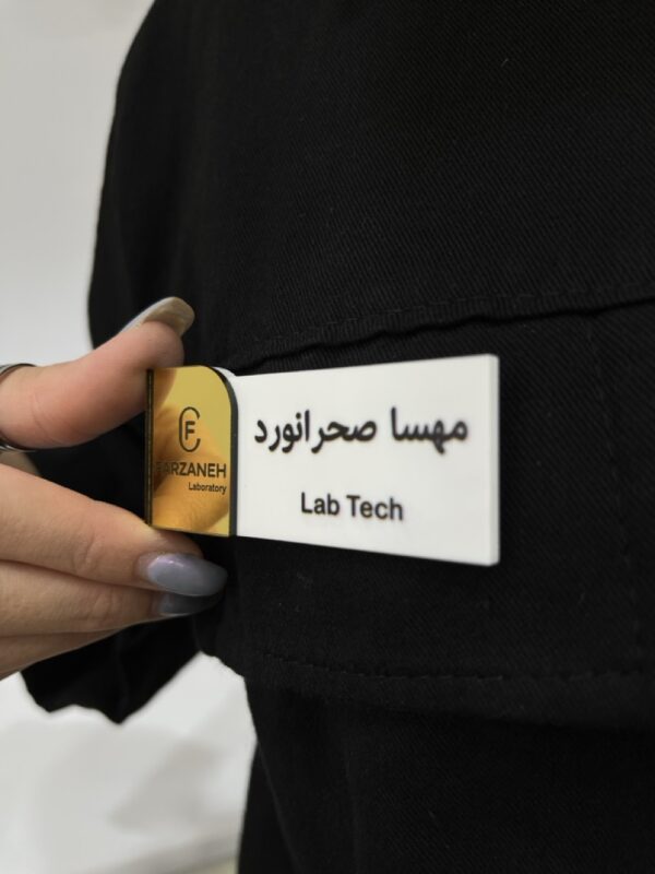 یکی از ویژگیهای برجسته این بج، چاپ با کیفیت و ماندگاری بالاست که باعث میشود حتی پس از استفاده طولانیمدت نیز ظاهر محصول بدون تغییر باقی بماند. پلکسی استفاده شده کاملاً ضدخش و مقاوم در برابر ضربه است و لبههای صیقلی و براق آن جلوهای خاص به این بج میبخشد. نصب راحت با گیره قوی در پشت بج، خیال شما را بابت ماندگاری و ثبات آن روی لباس راحت میکند. این بج سینه مخصوصاً برای پرسنل آزمایشگاه (Lab Tech) طراحی شده اما برای هر شغل و مجموعهای قابل سفارش است.
