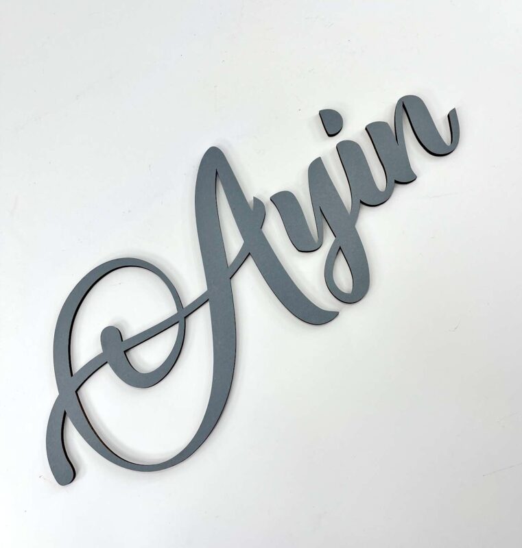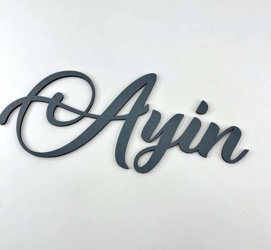 این تابلو از چوب سهلایه با ضخامت مناسب ساخته شده و به صورت دستی با رنگهای خاص چوب رنگآمیزی شده است. سبک طراحی با فونت پیوسته انگلیسی و منحنیهای نرم، حس کودکانه و صمیمی به آن میدهد.