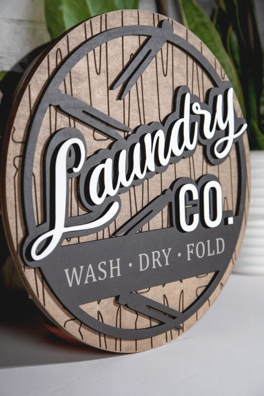 این تابلو با نوشتهی برجسته “Laundry Co.” و عبارتهای WASH • DRY • FOLD روی چوب سهلایه با ضخامت ۳ میلیمتر ساخته شده. طراحی دایرهای با پسزمینهای از طرح چوب طبیعی و استفاده از تایپوگرافی مدرن و لایهدار، این تابلو رو به یک آیتم دکوراتیو کاملاً منحصربهفرد تبدیل کرده.