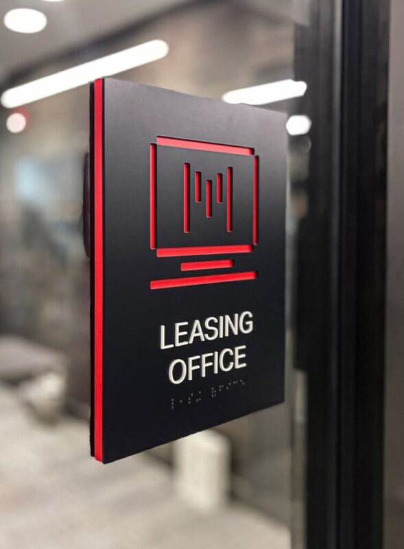 ترکیب رنگ مشکی مات با زیرلایه قرمز براق، جلوهای چشمگیر ایجاد کرده که از دور هم توجه را جلب میکند. نوشتهی “LEASING OFFICE” به همراه آیکون گرافیکی مینیمال، مفهوم حرفهای و واضحی را منتقل میکند و نصب آن روی شیشه یا دیوار دفاتر، حس نظم، برندینگ و اعتماد را به مراجعهکنندگان القا میکند.