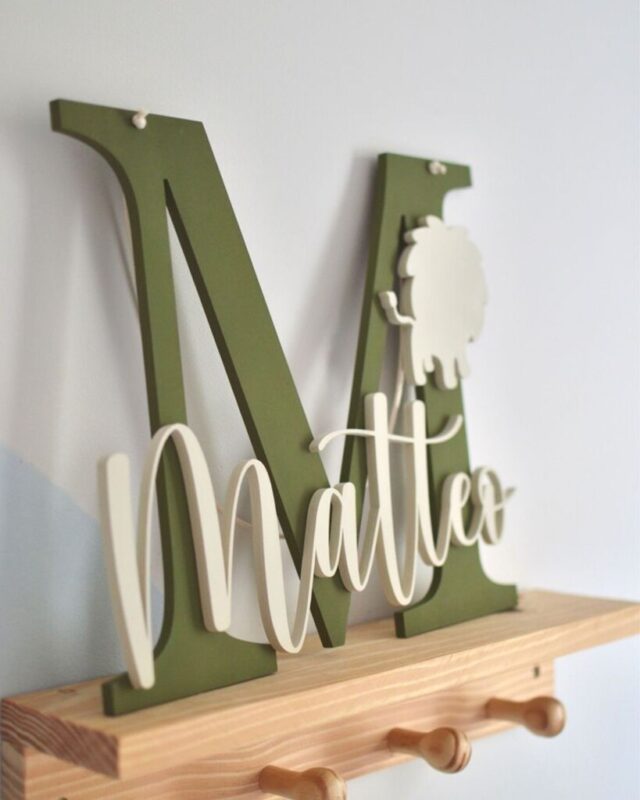 در این طراحی خاص، حرف بزرگ به رنگ سبز زیتونی مات رنگآمیزی شده و اسم “Matteo” به رنگ کرم روشن و به صورت خطی روی آن قرار گرفته که زیبایی چشمگیری ایجاد میکنه. استفاده از طرح شیر کوچولوی بامزه در کنار اسم، حس کودکانه و فانتزی کار رو بیشتر کرده 🦁💚