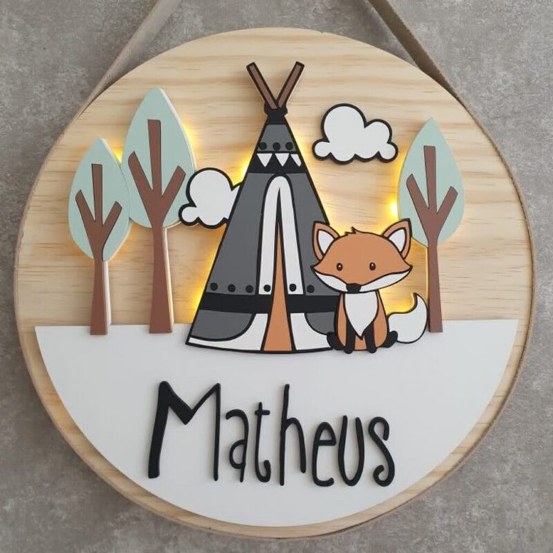 تابلو دایرهای با ترکیب رنگهای ملایم و طراحی چندلایه کارتونی. شخصیت روباه، چادر و درختان روی زمینه چوبی نصب شدهاند. نور مخفی گرم از پشتتابلو ساطع میشود و جلوهای آرامشبخش به فضا میبخشد.