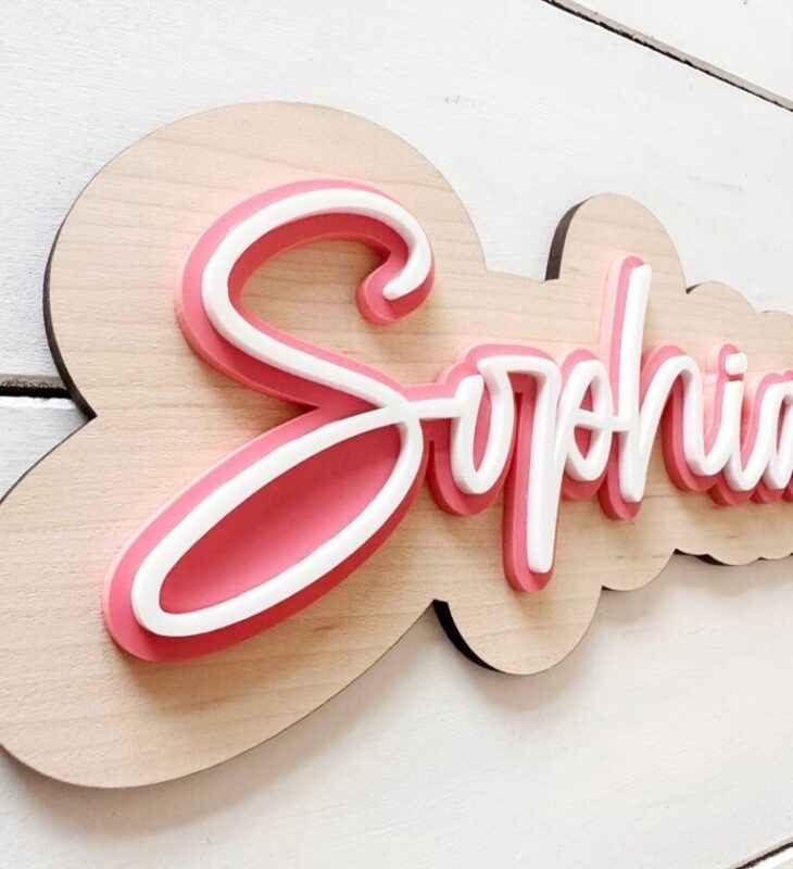 این تابلو از چوب سه لایه با ضخامت مناسب به عنوان پایه ساخته شده و حروف اسم با پلکسی ضخیم و رنگی بهصورت برجسته روی آن نصب شدهاند. لایهبندی سهبعدی و ترکیب رنگ جذاب، ظاهری شیک و کودکانه به محصول داده است.