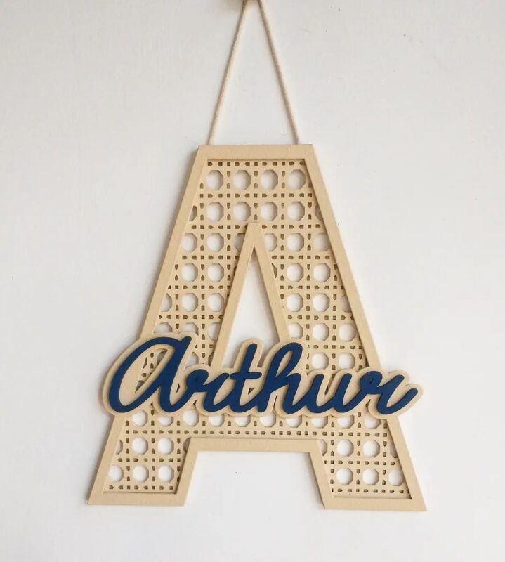 این تابلو از چوب سهلایه ساخته شده و دارای طراحی حصیری در زمینه به همراه اسم برجسته است. رنگبندی حروف اسم قابل انتخاب بوده و سبک طراحی آن مینیمال و کودکانه است.