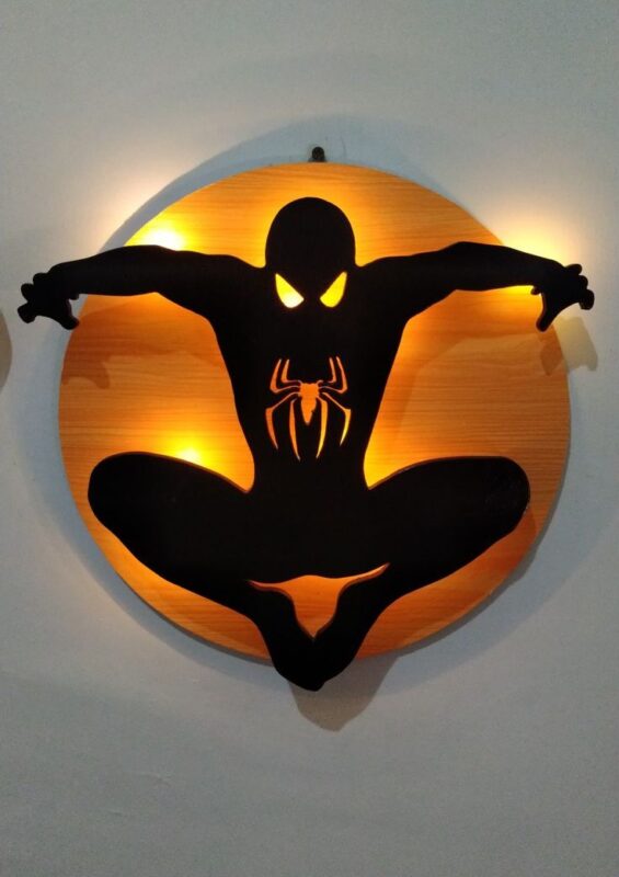 تابلو به شکل دایره طراحی شده و شخصیت اسپایدرمن با رنگ مشکی مات از پلکسی ۳ میل روی زمینه چوبی قرار گرفته است. نور LED از پشت، با درخشش گرم و ملایم، باعث برجستگی زیبای فرمها و ایجاد حالتی سینمایی میشود.