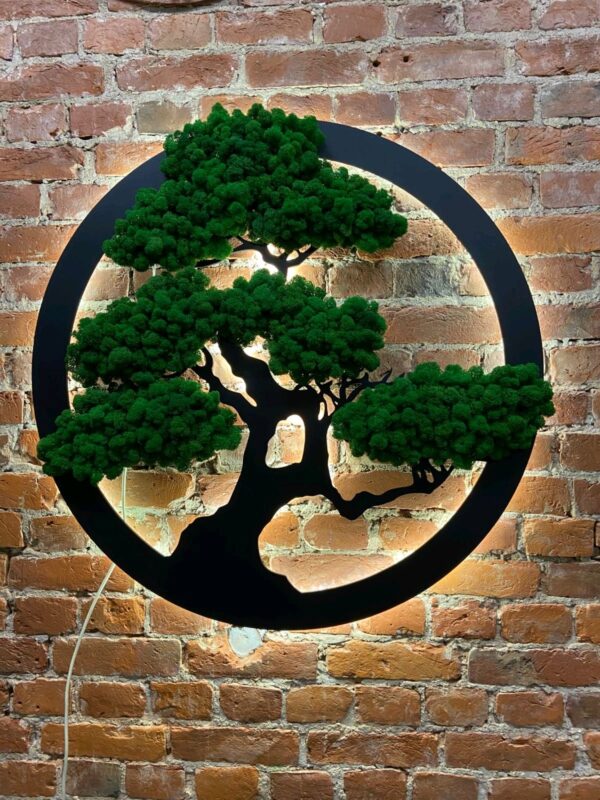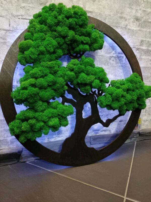 تابلو دارای قاب دایرهای چوبی با طراحی بونسای و پوشش خزه طبیعی است. نورپردازی LED مخفی در پشت کار، زیبایی آن را در محیطهای مختلف دوچندان میکند.