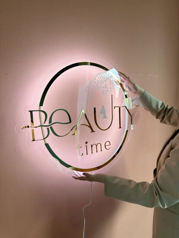 طرح دایرهای و نوشته Beauty Time با فونت طلایی و جزئیات چشمنواز، ظاهری مدرن و بسیار حرفهای به تابلو داده. نور ملایم و یکنواخت LED، به کمک آداپتور مخصوص، از پشت پلکسی پخش میشه و باعث میشه نوشتهها و طرح تابلو در شب و روز بدرخشه. این محصول نه تنها یک تابلو تبلیغاتیه، بلکه یک اکسسوری دکوراتیو برای سالن یا مزون هم محسوب میشه.