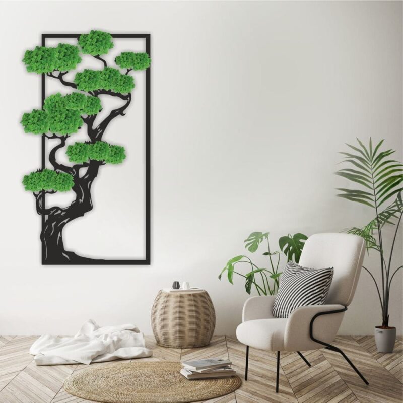 در طراحی این تابلو از چوب سهلایه با ضخامت ۳ میلیمتر استفاده شده که با برش دقیق، فرم درخت بونسای را بهصورت مینیمال و مدرن نمایش میدهد. خزههای طبیعی بهکاررفته در این اثر، علاوه بر زیبایی، خاصیت تصفیه هوا داشته و حس حضور در طبیعت را به شما منتقل میکند. 🌳👌