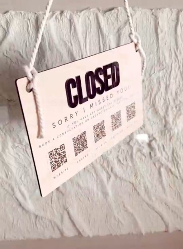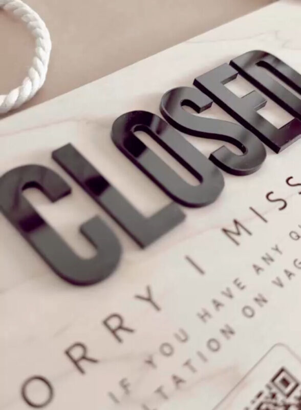 تابلو از چوب سهلایه با ضخامت ۳ میلیمتر ساخته شده که در کنار حروف برجسته پلکسی، جلوهای لوکس و مدرن ایجاد کرده است. طراحی دوطرفه امکان نمایش دو حالت “OPEN” و “CLOSED” را بهراحتی فراهم میکند.
