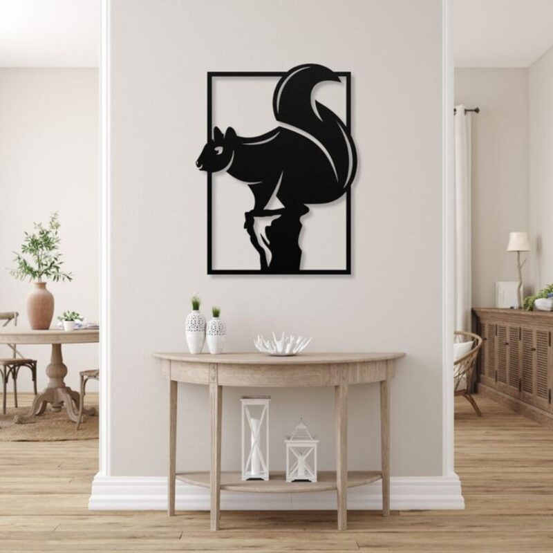 این تابلو از چوب سهلایه ساخته شده و به رنگ مشکی مات طراحی شده است. طرح سنجاب در یک قاب مستطیلی حک شده و ظاهری زیبا و برجسته دارد.