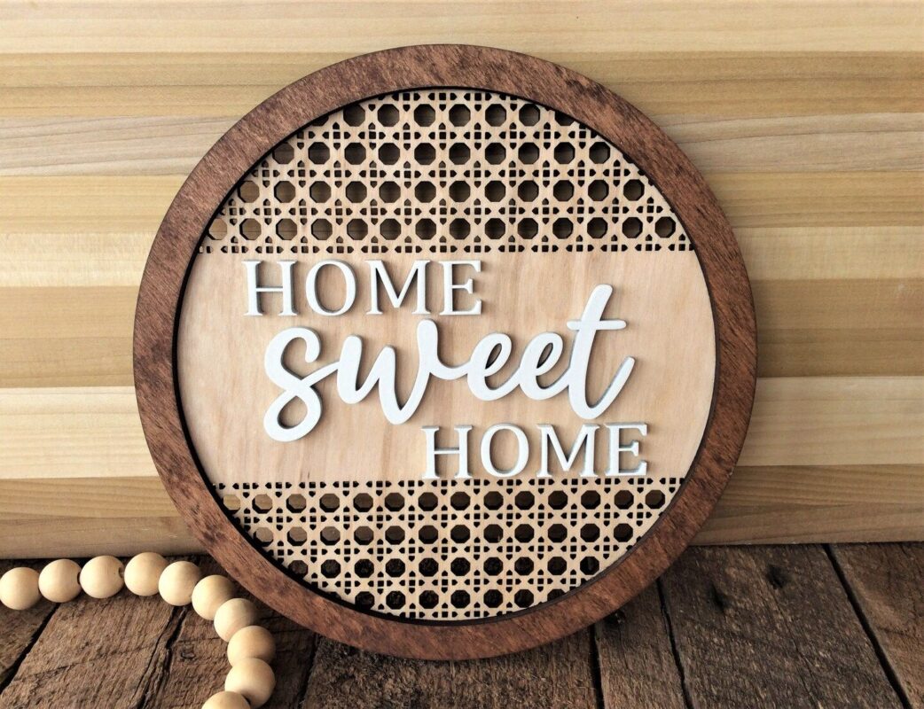 جنس بدنه از چوب سهلایه با رنگآمیزی دستی، طراحی گرد با طرح مشبک، نوشته برجسته Home Sweet Home با رنگ سفید، سبک و قابل نصب آسان.