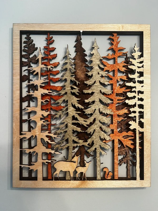 این تابلو دارای طراحی سهبعدی از جنگل و حیوانات با جزئیات فوقالعاده است. ترکیب رنگهای طبیعی چوب با جلوههای سهبعدی، زیبایی خیرهکنندهای به آن بخشیده است.