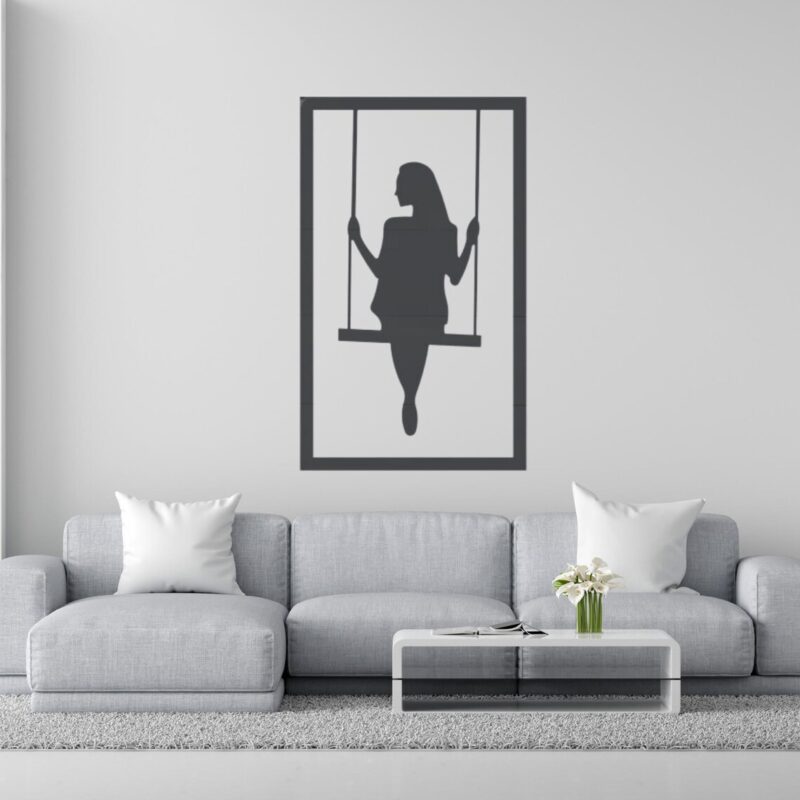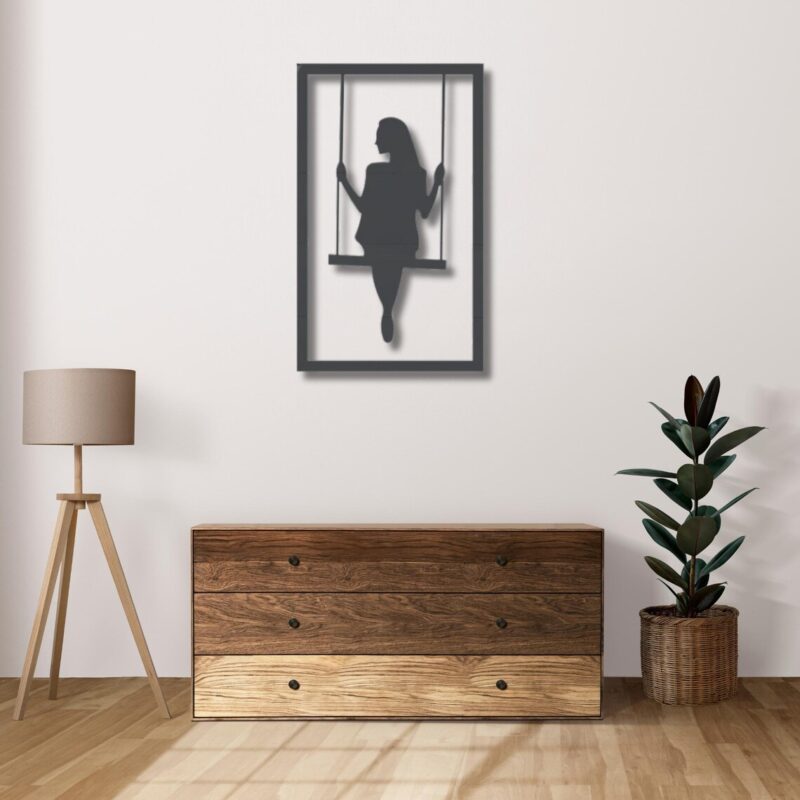 این تابلو به شکل یک قاب عمودی طراحی شده که تصویر دختری نشسته بر تاب را بهصورت سیلوئت مشکی به نمایش میگذارد. جنس تابلو از چوب سهلایه روسی ۳ میلیمتر است و با رنگ مشکی باکیفیت پوشش داده شده. ظرافت در خطوط و توازن ابعاد، زیبایی خاصی به آن بخشیده است.