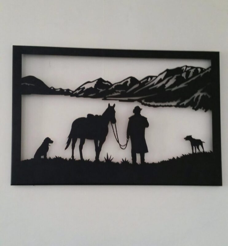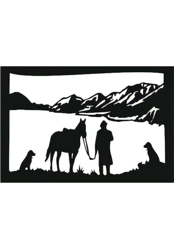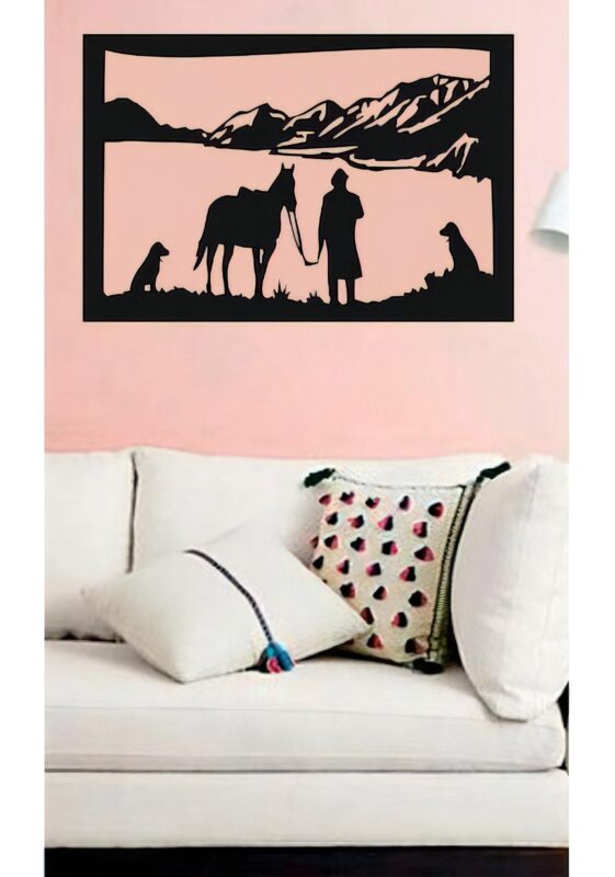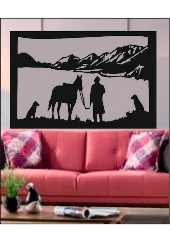 اگر به دنبال یک تابلو دیواری منحصر به فرد با اثری بینظیر هستید، تابلو دیواری دکوراتیو مدل TH_79298 گزینهی ایدهآلی برای شماست. این تابلو با مواد ام دی اف بسیار با کیفیت ساخته شده و با رنگ مشکی آسودهآمیز، با طرحی جذاب و شگفتانگیز مردی با اسب و دو سگ در کنار خود را به تصویر میکشد.
