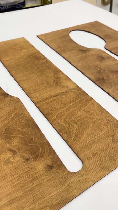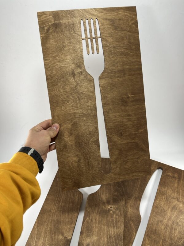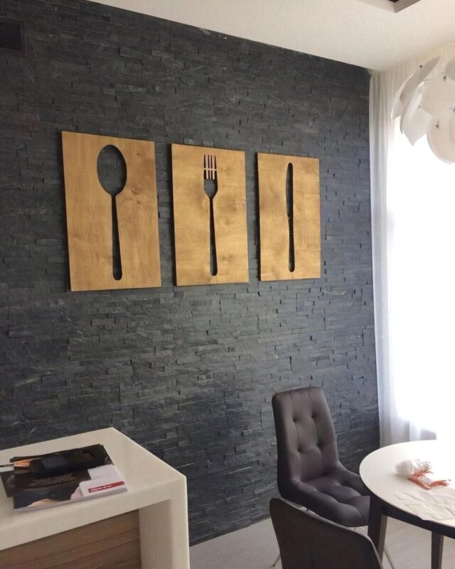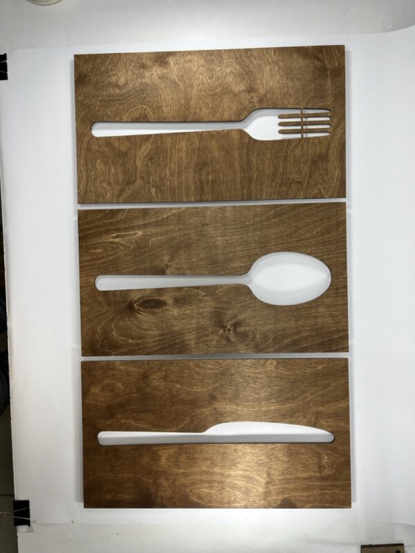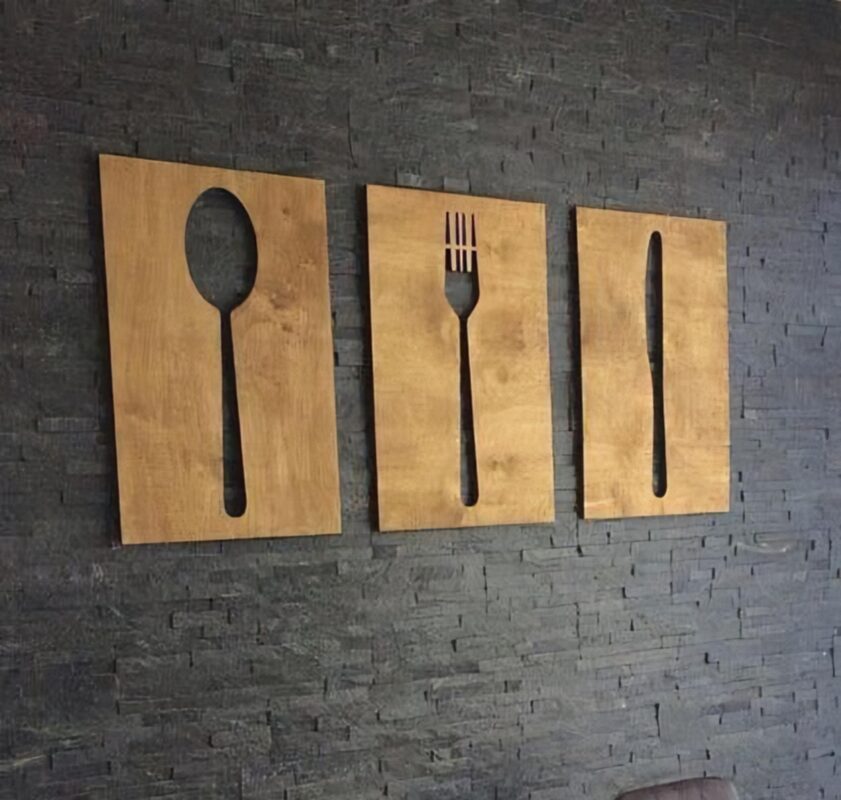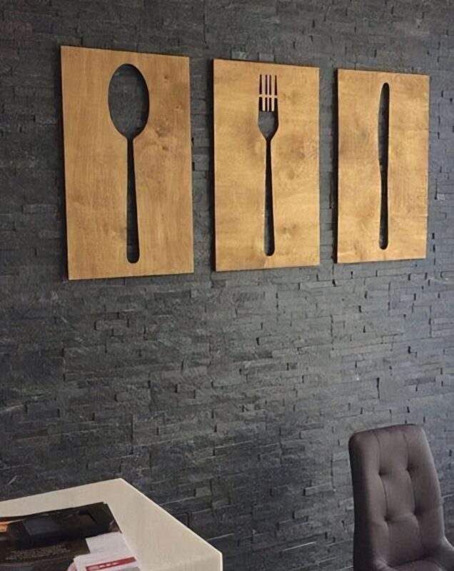 این تابلو سه تیکه ی چوبی طرح کارد و قاشق چنگال است که بسیار شیک است ابعاد این تابلو 90 در 50 است و با متریال چوب سه لایی روسی ساخته میشود .