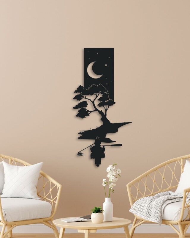 ساخته شده از چوب سهلایه با ضخامت ۳ میلیمتر، طراحی عمودی با جزئیات برجسته قایق، درخت و ماه، مناسب برای نصب روی دیوار با جلوه سهبعدی.