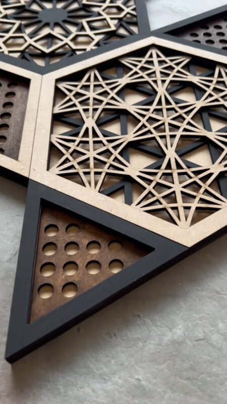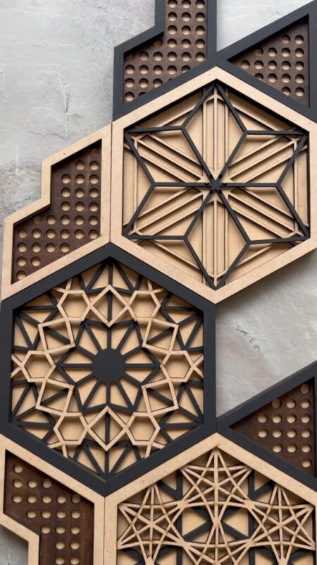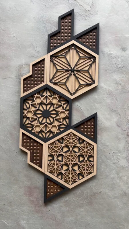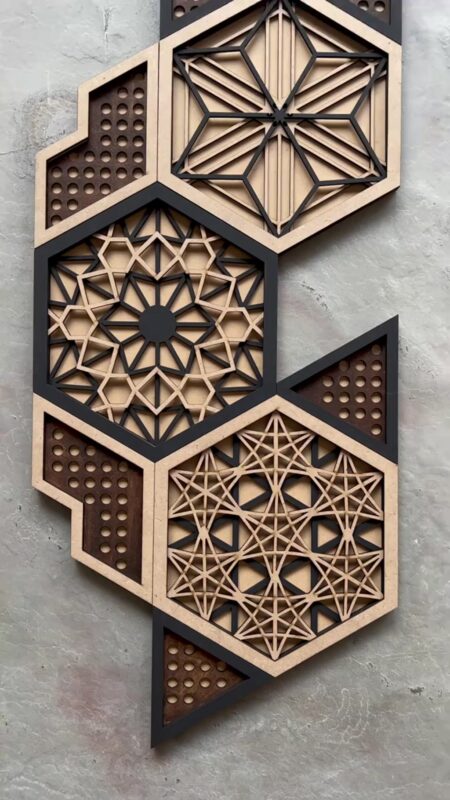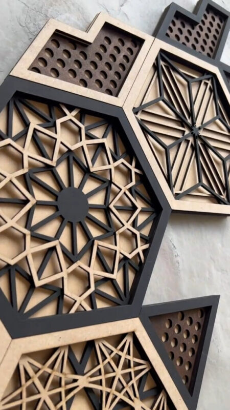 این تابلو با بهرهگیری از برشهای دقیق لیزری و طراحی چندلایه، جلوهای برجسته و سهبعدی دارد که روی دیوار تأثیری خارقالعاده ایجاد میکند. ترکیب رنگهای طبیعی چوب و استفاده از الگوهای هندسی و سنتی، باعث شده این محصول برای دکوراسیونهای مدرن، مینیمال و حتی کلاسیک مناسب باشد.