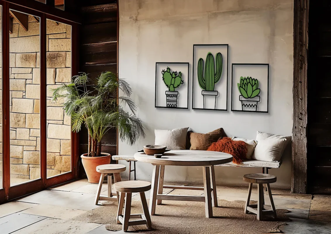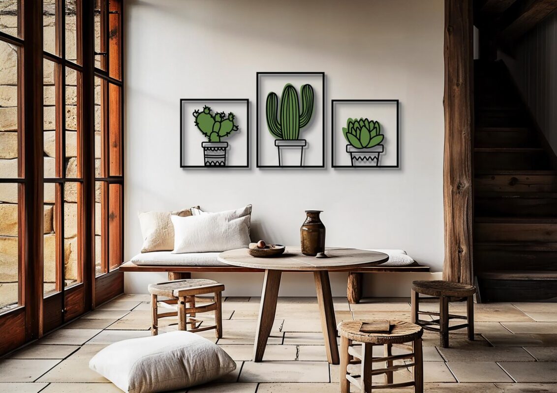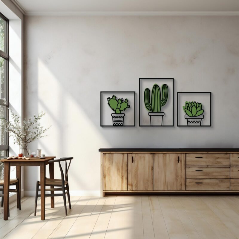 این محصول از چوب سهلایه با ضخامت 3 میلیمتر ساخته شده و دارای طراحی سهتایی از گلدانهای کاکتوس و ساکولنت است که در قابهای جداگانه قرار گرفتهاند. ترکیب رنگهای سبز و مشکی در این اثر، جلوهای خاص و هماهنگ با دکوراسیونهای **bohemian، modern و Scandinavian** ایجاد کرده است.