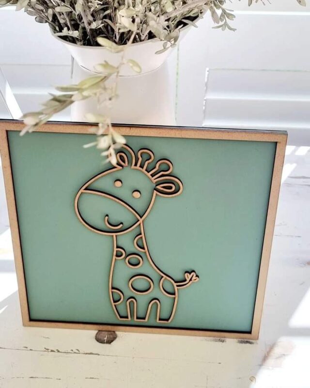 تابلو مربعی شکل با طرح کارتونی زرافه که با لبههای نازک چوبی و زمینه سبز ملایم طراحی شده است. جنس محصول چوب سه لایه ۳ میلیمتر و برش دقیق لیزری است.