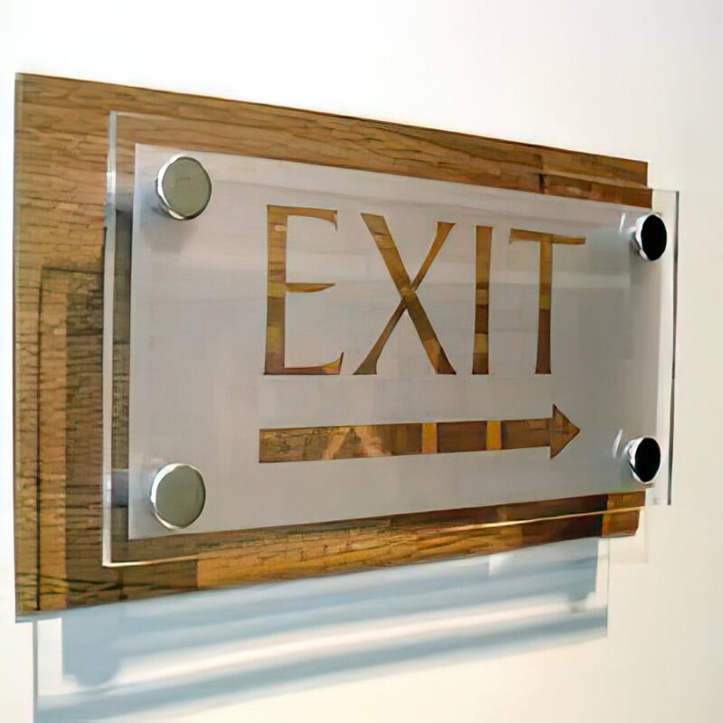 این تابلو دارای ترکیب زیبای پلکسی شفاف و چوب طبیعی است. نوشته EXIT با تکنولوژی برش دقیق روی پلکسی ایجاد شده که وضوح بالا و جلوهای شیک داره. استفاده از اسپیسرهای فلزی برای نصب، جلوهای حرفهایتر به این تابلو میبخشه.