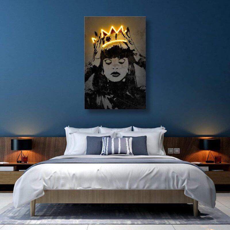این تابلو تصویری مدرن و مینیمالیستی از یک زن با تاج درخشان را نمایش میدهد. نور نئونی طلایی بر روی تاج، حس لوکس و سلطنتی به این طراحی اضافه کرده و جلوهای خاص به دیوار شما میبخشد.