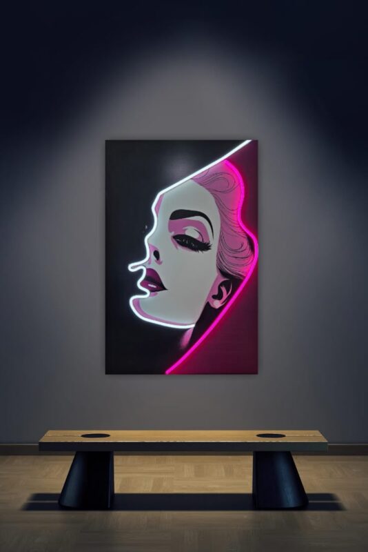این تابلو دارای طراحی منحصربهفرد از یک پرتره هنری با نورپردازی نئونی سفید و صورتی است که تضاد زیبایی را با پسزمینه تیره ایجاد کرده و جلوهای فوقالعاده به دیوار شما میبخشد.