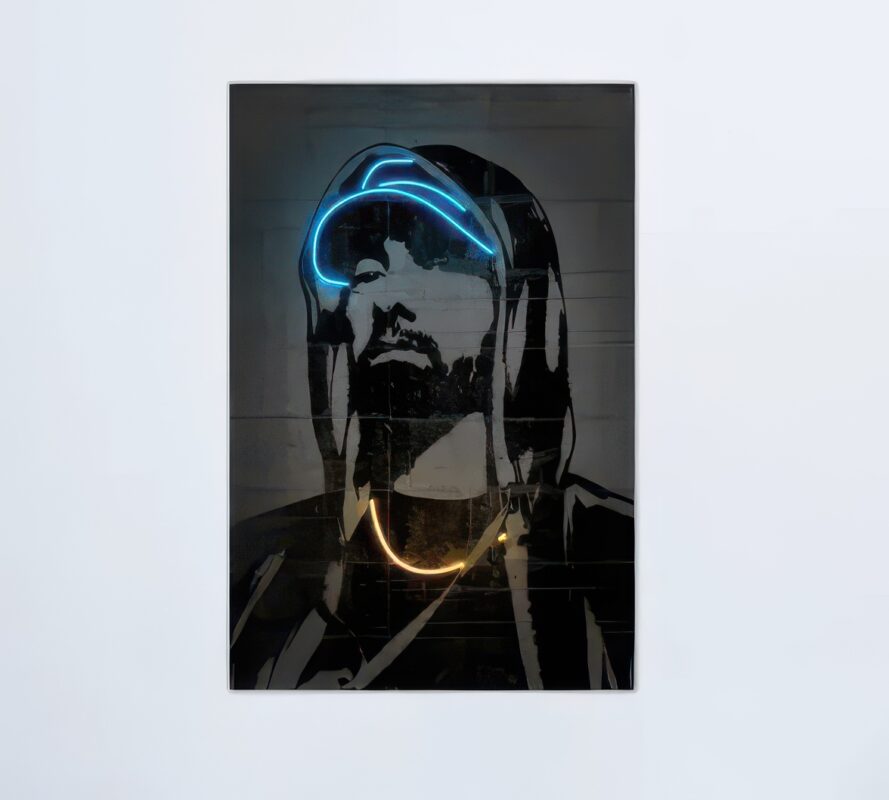 این تابلو شامل تصویر چهره Eminem است که با طراحی خاص و نئونهای فلکس، جلوهای منحصربهفرد پیدا کرده است. بخشهای کلاه با نور آبی و گردنبند با نور طلایی، جذابیت این اثر را دوچندان کرده است.