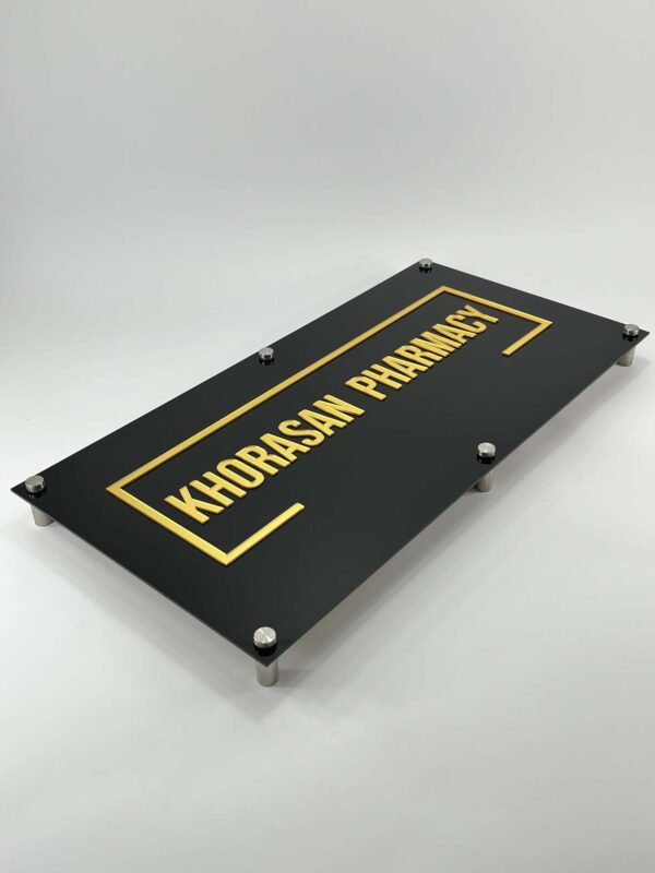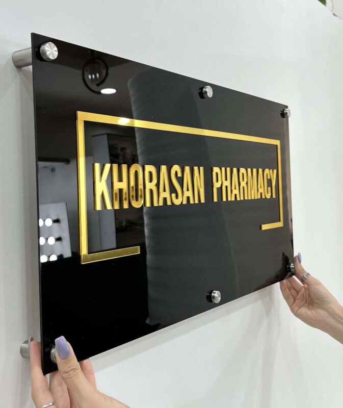 این تابلو انتخابی عالی برای داروخانهها، مطب پزشکان، دفاتر کاری، شرکتها، سالنهای زیبایی و هر مکانیست که نیاز به تابلویی حرفهای و شیک دارد. استفاده از حروف برجسته طلایی، باعث دیده شدن بهتر برند و افزایش اعتماد مشتری میشود.