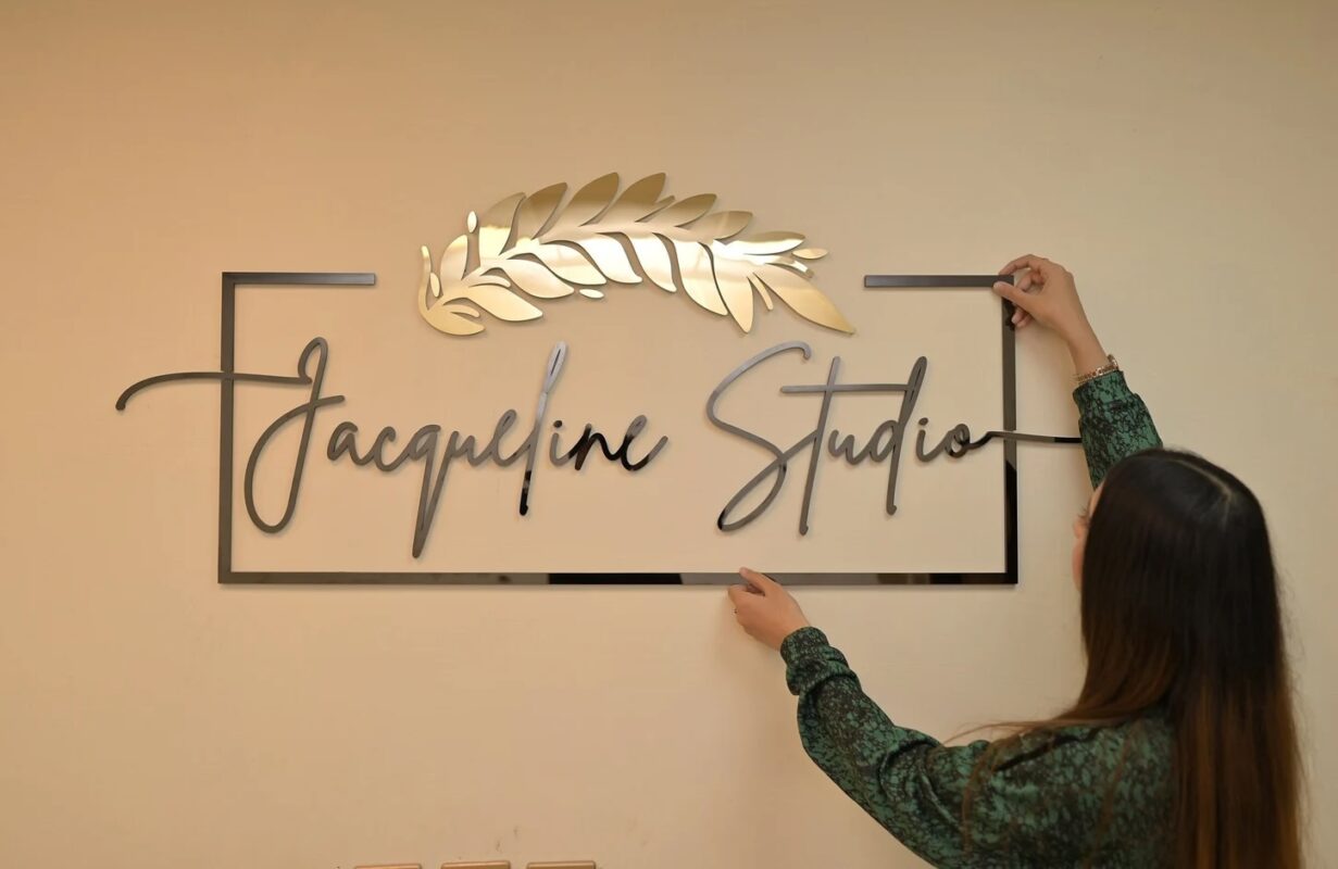 نام برند یا لوگو با فونت اسکریپت خاص روی پلکسی مشکی برش خورده و در مرکز قاب قرار گرفته. بالای تابلو نیز با یک برگ طلایی براق تزئین شده که حس خاص بودن و زیبایی طبیعی رو به شکل هوشمندانهای منتقل میکنه. همه اجزا از پلکسی ۳ میلیمتری با برش دقیق لیزری ساخته شده و بهصورت برجسته روی دیوار نصب میشن، که هم در نور طبیعی و هم در نور داخلی جلوه فوقالعادهای دارن.