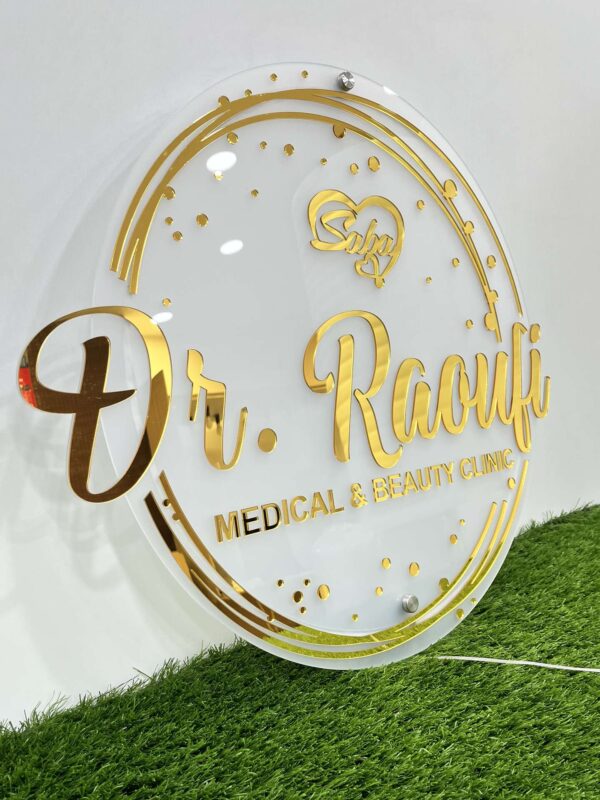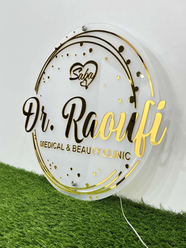 تابلو لوگو پلکسی بک لایت با طراحی دایرهای و استفاده از پلکسی شفاف و آینهای، بههمراه نورپردازی LED، ظاهری لوکس و حرفهای دارد. نوشتهها و لوگوها بهصورت برجسته روی پلکسی قرار گرفتهاند و نور پسزمینه، جلوهای جذاب و چشمنواز به آنها میدهد.