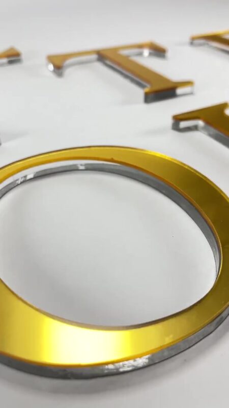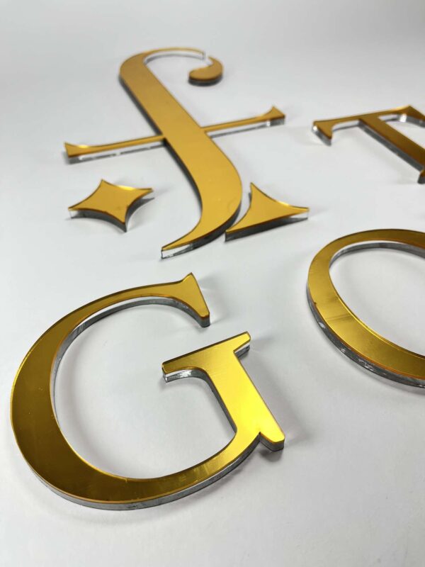 حروف برجسته از دو لایه تشکیل شدهاند: پلکسی آینهای طلایی به عنوان لایه رویی و پلکسی شفاف به عنوان لایه زیرین. این ترکیب باعث افزایش مقاومت و زیبایی تابلو شده و جلوهای شفاف و درخشان به آن بخشیده. ابعاد حروف و لوگو قابل سفارشسازی هستند.