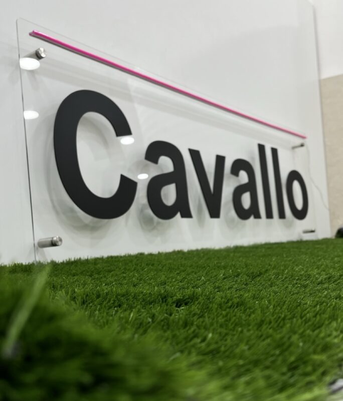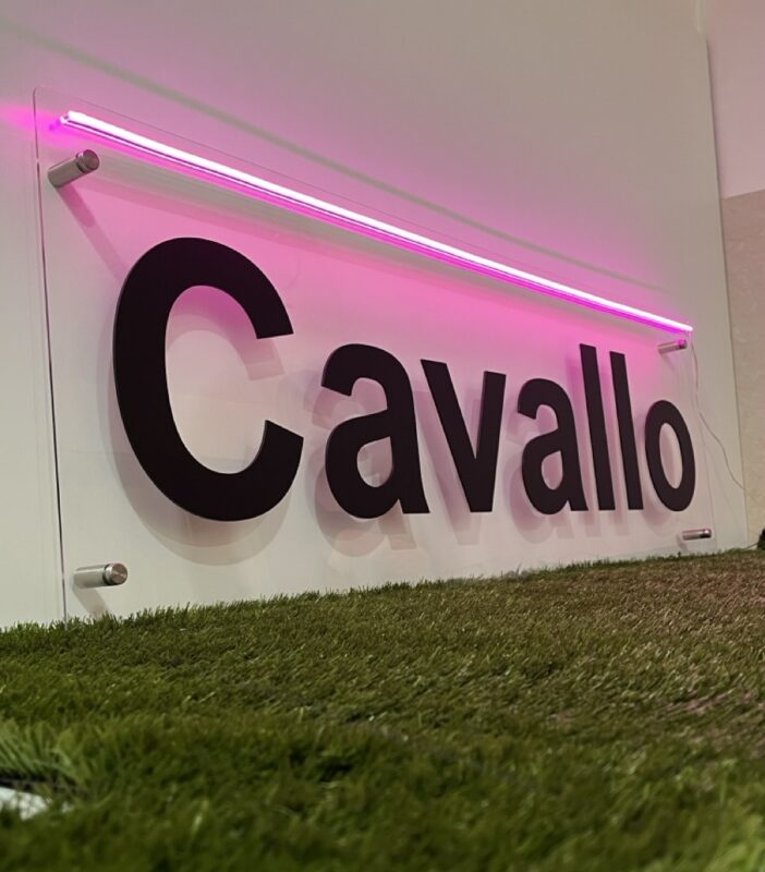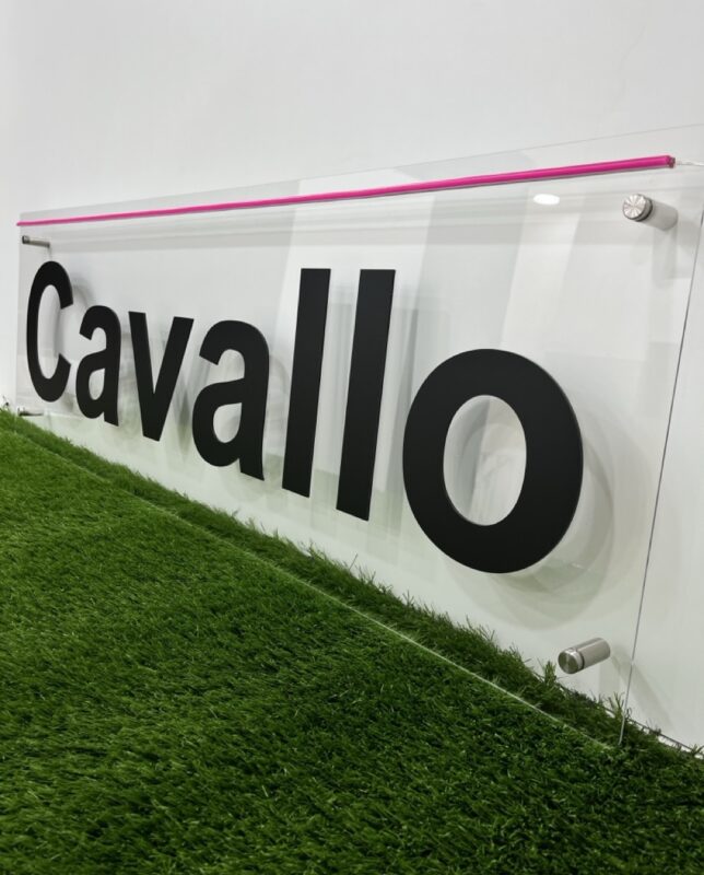 زمینه پلکسی شفاف ۳ میل، حروف پلکسی مشکی ۳ میل، نور نئون صورتی در بالای تابلو، نصب با اسپیسر فلزی، اجرا بهصورت دیواری با جلوه برجسته و نورپردازی چشمگیر.